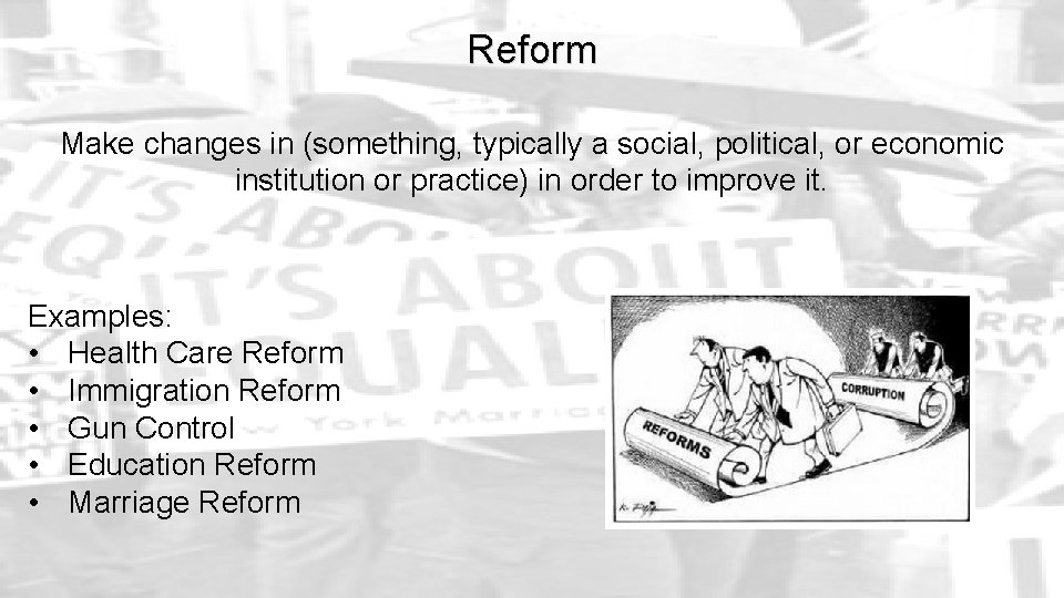 Reform Make changes in something typically a social