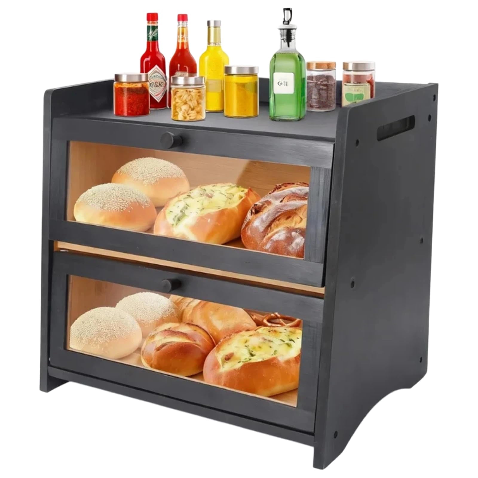 Double Layer Bread Box For Countertop - Large Black Kitchen Storage (15 ...