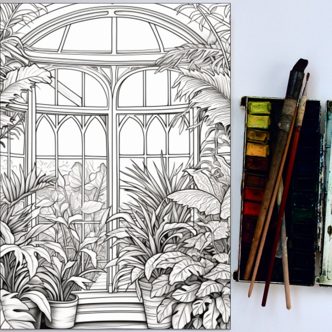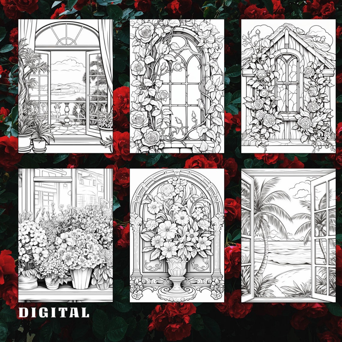 50 Blooming Windows Grayscale Coloring Pages Printable for Adults, PDF ...