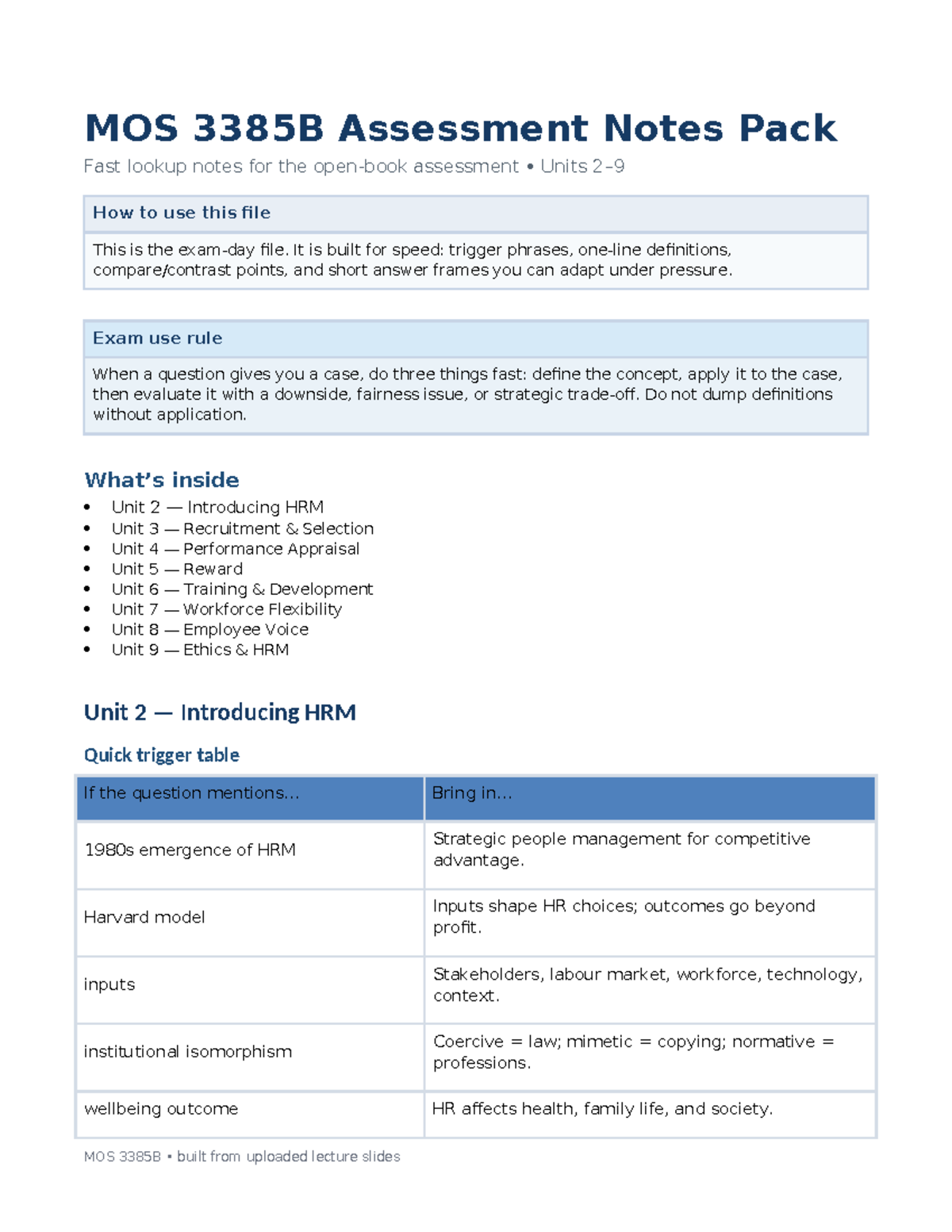 MOS 3385B Assessment Notes Pack: Quick Reference for HRM Concepts - Studocu
