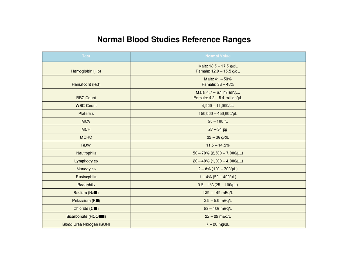 Normal Blood Studies Reference Ranges and Values - Studocu
