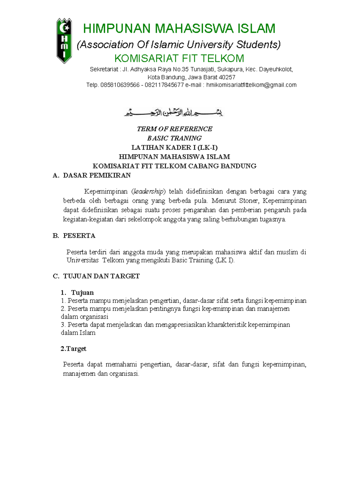 Term of Reference: Basic Training (LK I) HMI Komisariat FIT Telkom ...