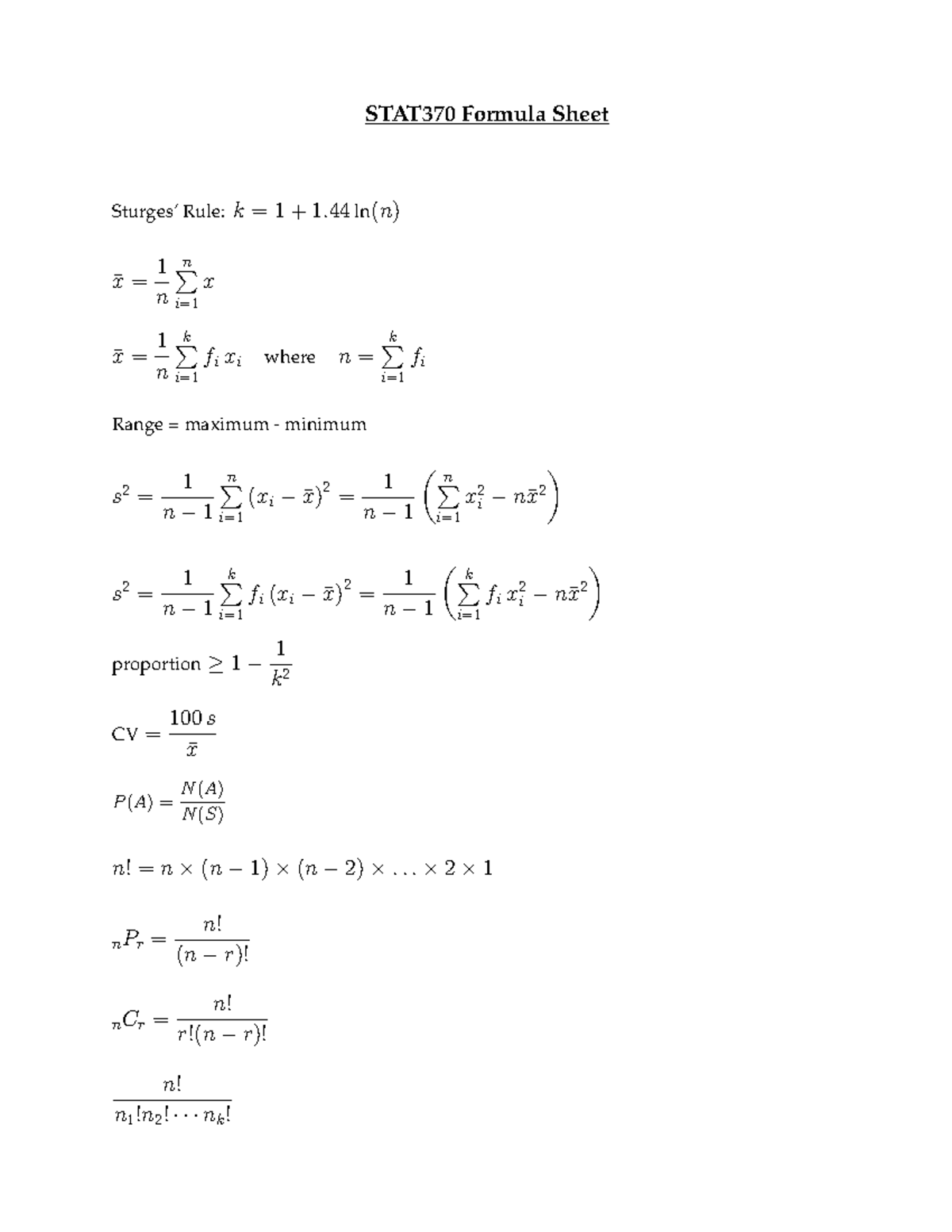 STAT370 Engineering Stats Formula Sheet for Quick Reference - Studocu