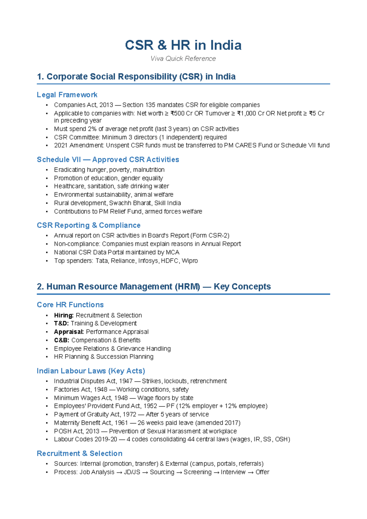 CSR HR in India: Quick Reference Notes for Viva Preparation - Studocu
