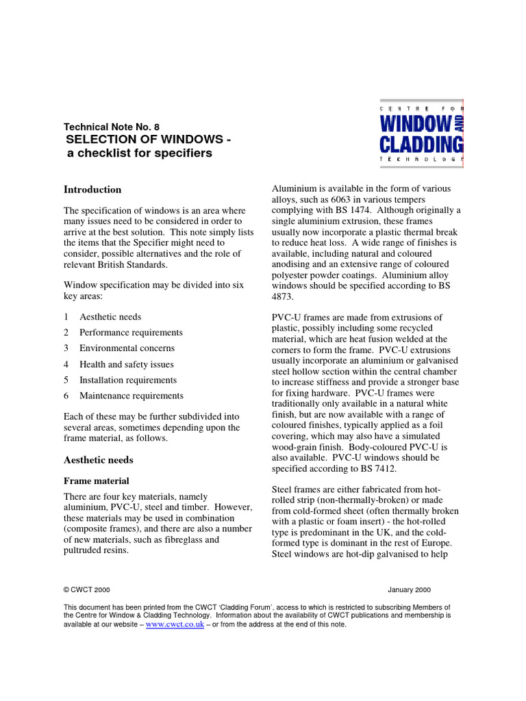 TN8 SELECTION OF WINDOWS - A Checklist For Specifiers | PDF | Window ...