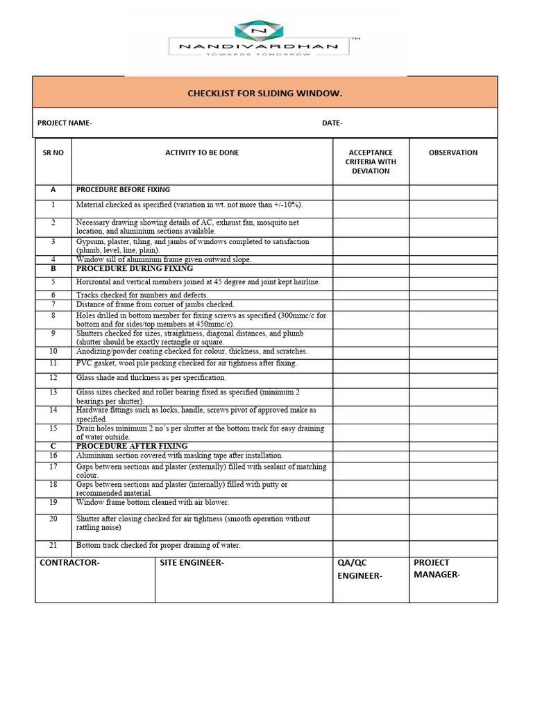 Inspection Checklist Form For Window Installation | PDF | Civil ...