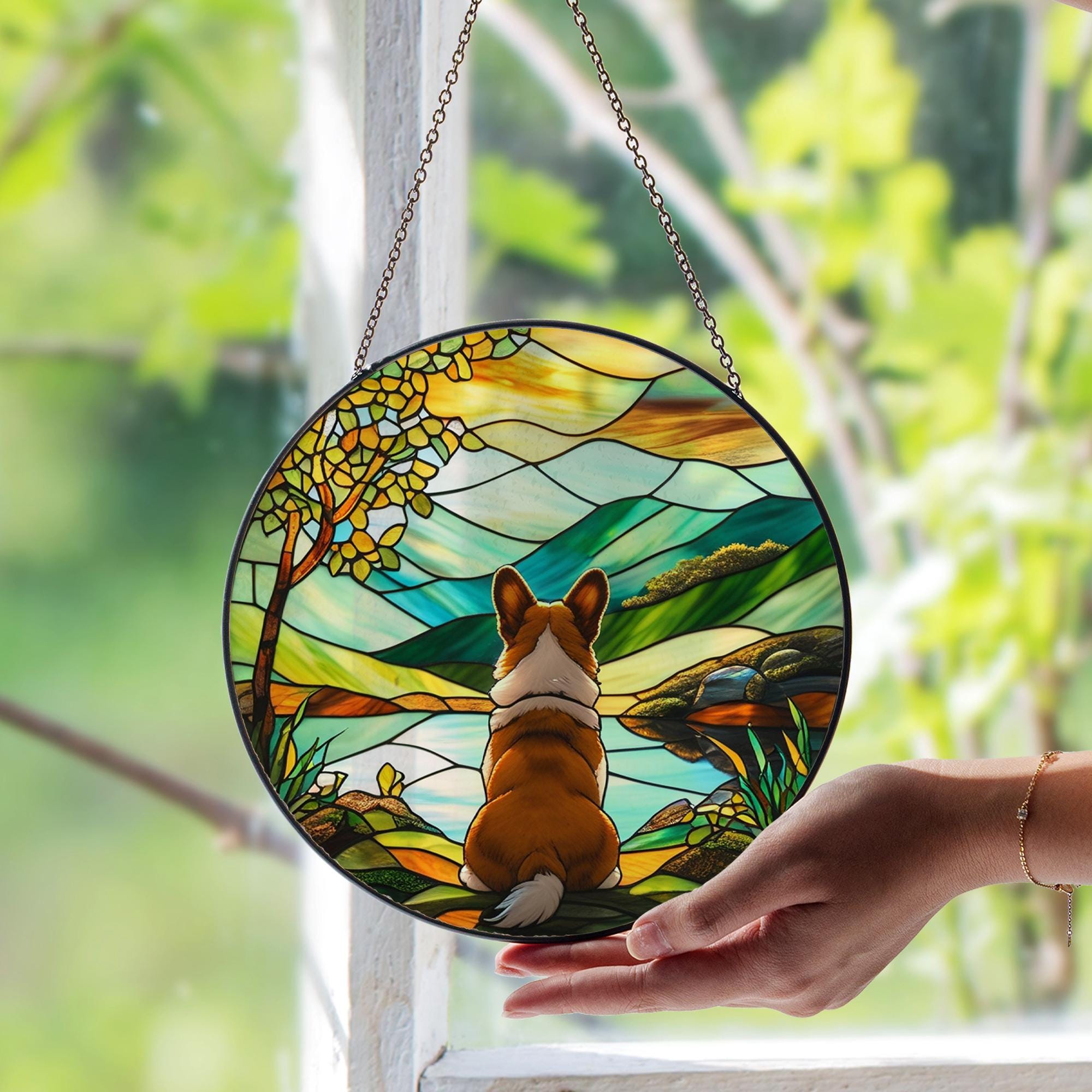 Corgi Flower Suncatcher - Stained Glass Window Hanging Decor, 7.9 Inch ...
