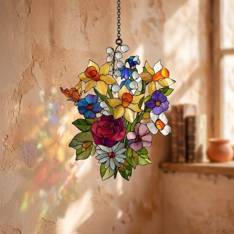 Floral Bouquet Suncatcher, Acrylic Spring Flower Butterfly Daffodil ...