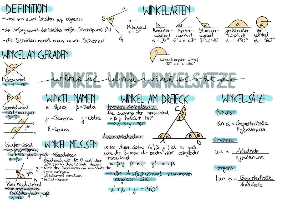 Mathe Spickzettel zum Thema Winkel. Erklärung der Bezeichnungen eines ...