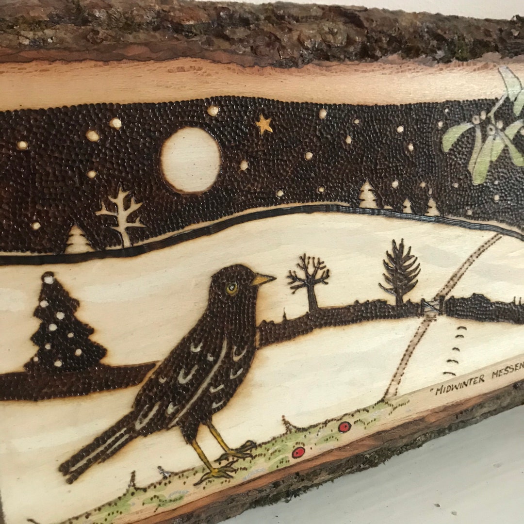 Midwinter Messenger Wooden Pyrography Art, Hanging Wooden Rustic Slice ...