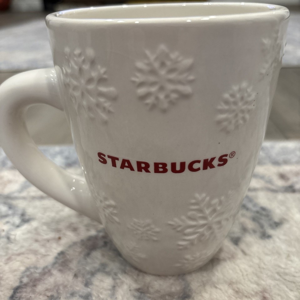 Starbucks Mug Embossed Snowflakes White Red Lettering 14oz | eBay