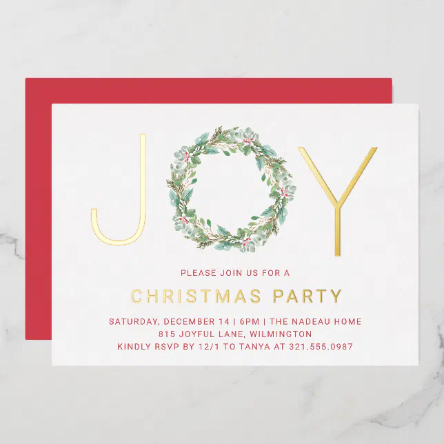 Simple Joy Wreath Elegant Christmas Party Foil Invitation | Zazzle