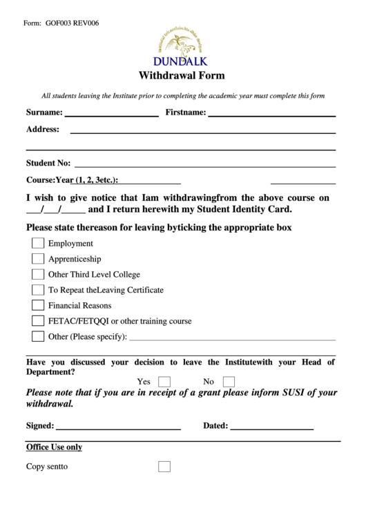 Institute Withdrawal Form printable pdf download