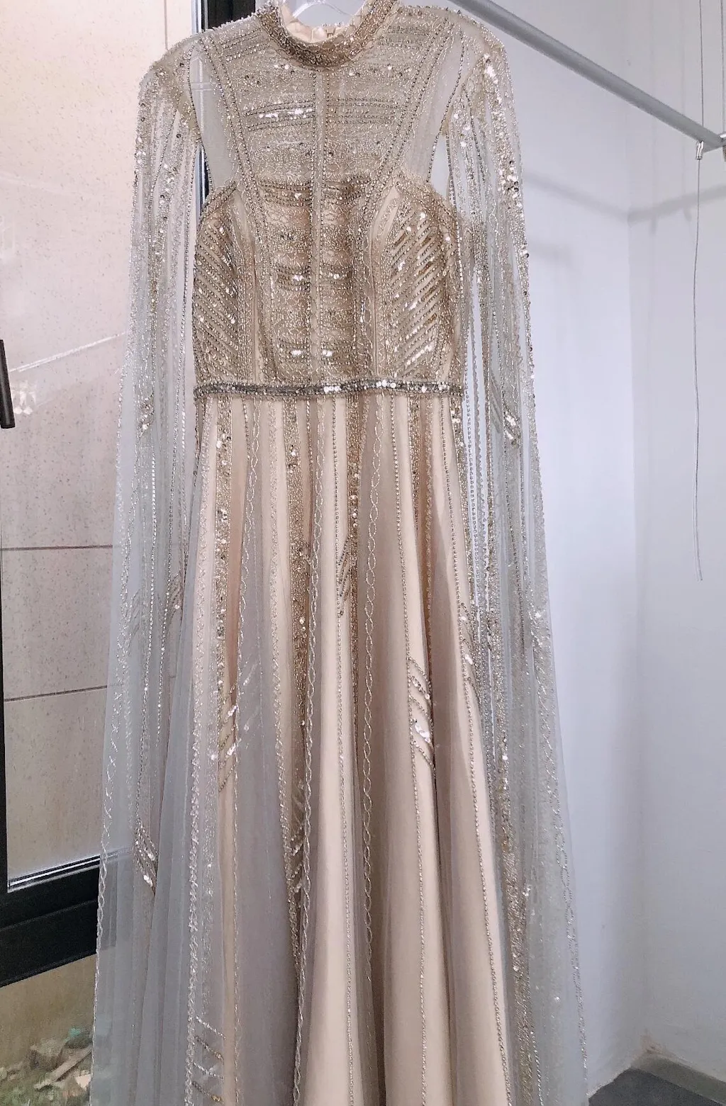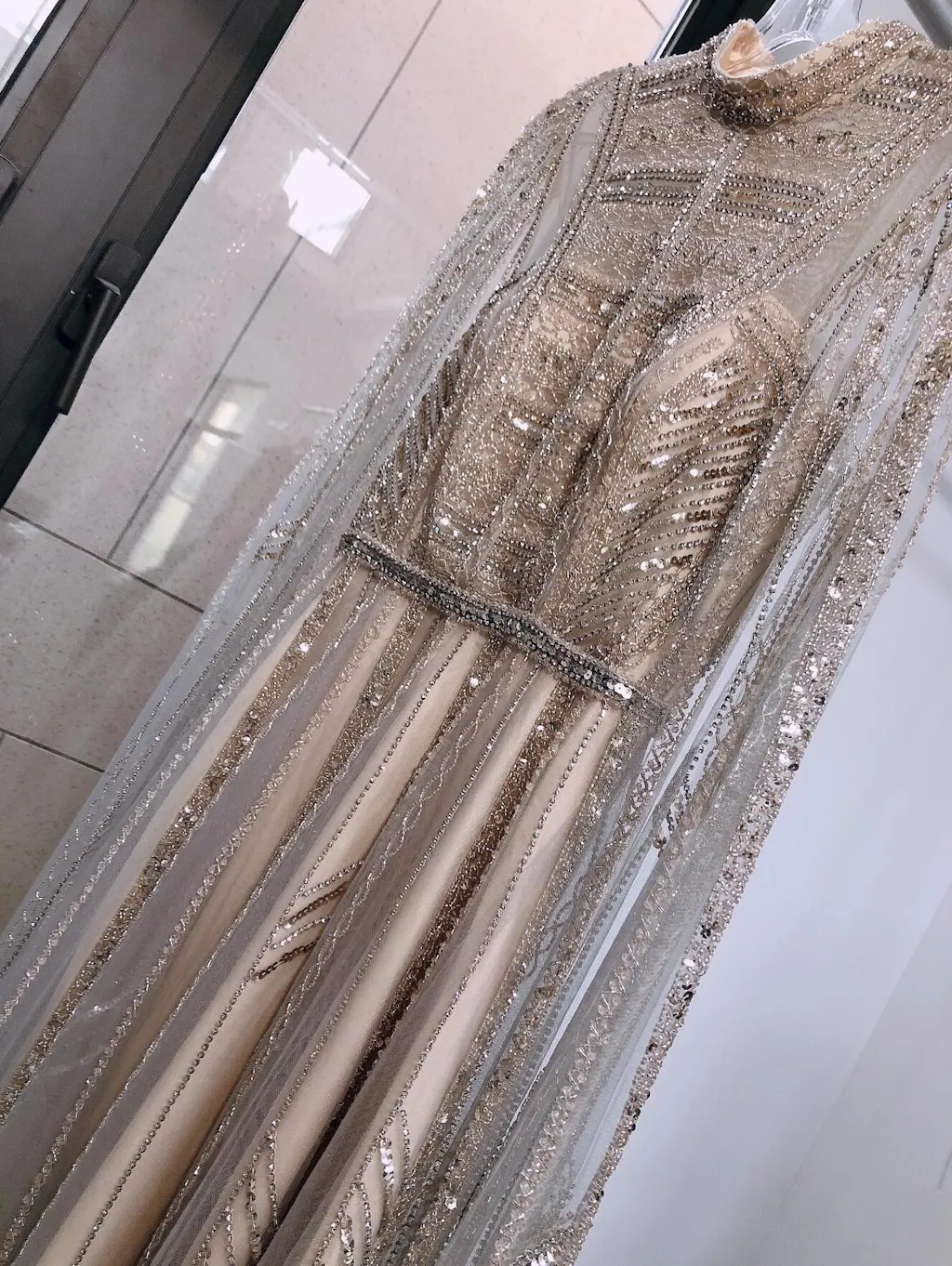 Luxury Dubai Grey Nude Evening Dresses with Cape Sleeves Elegant Women ...