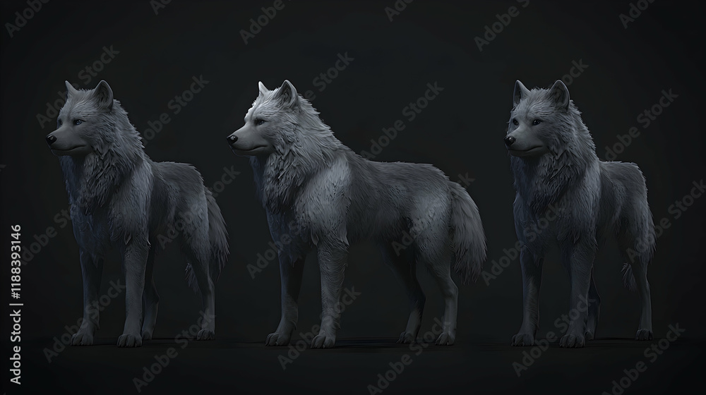 Arctic wolves 3D models, studio poses, dark background, game asset ...