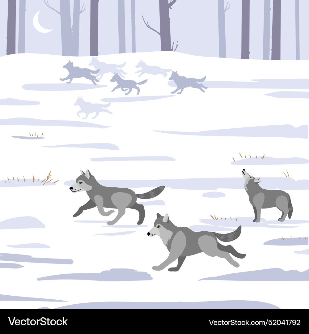 Drawing night snowy landscape with wolves Vector Image
