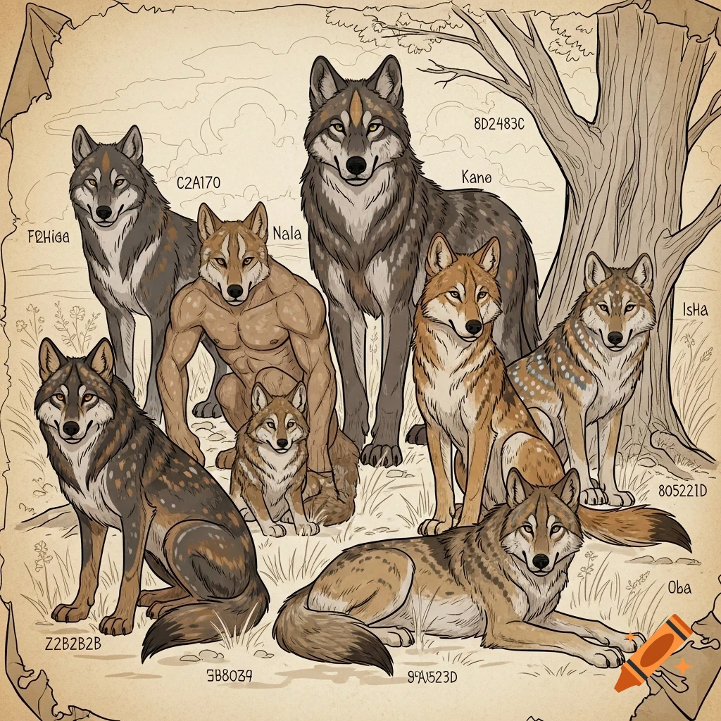 An illustration of seven diverse wolves and one muscular human-wolf ...