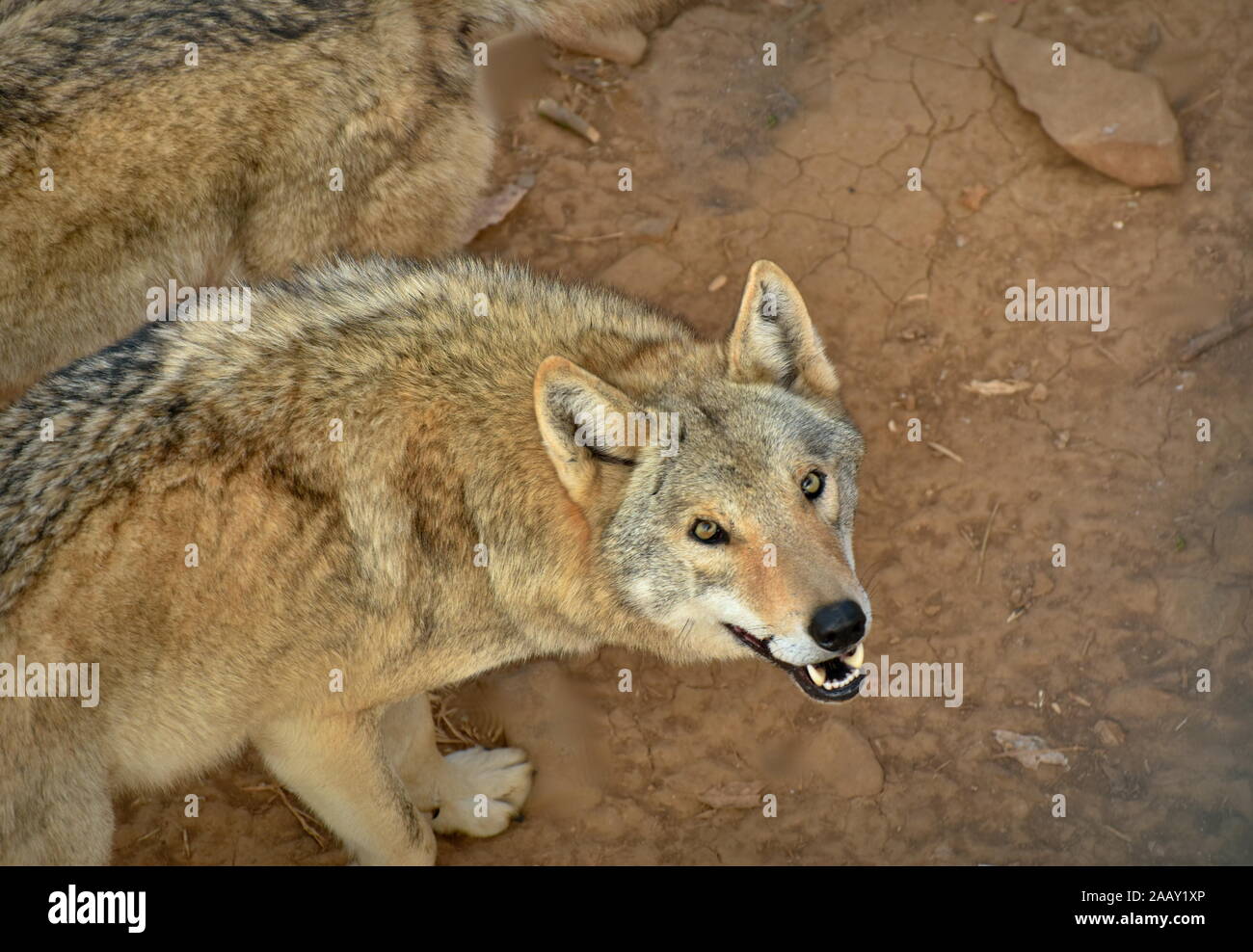Wolf looking up with teeth visible Stock Photo - Alamy