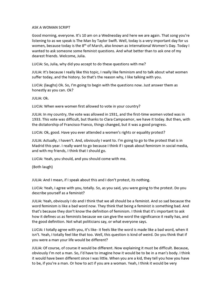 Ask A Woman Script | Download Free PDF | Feminism | Gender Studies