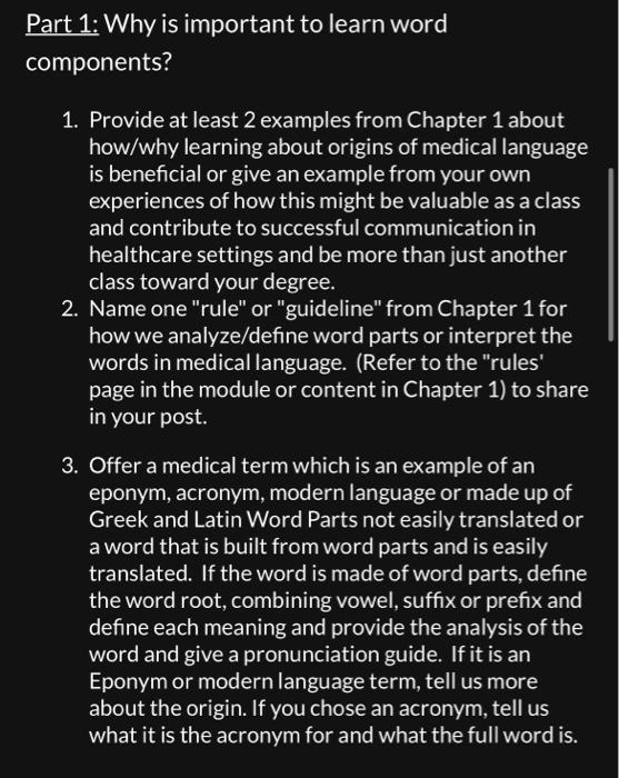Solved Part 1: Why is important to learn word components? 1. | Chegg.com