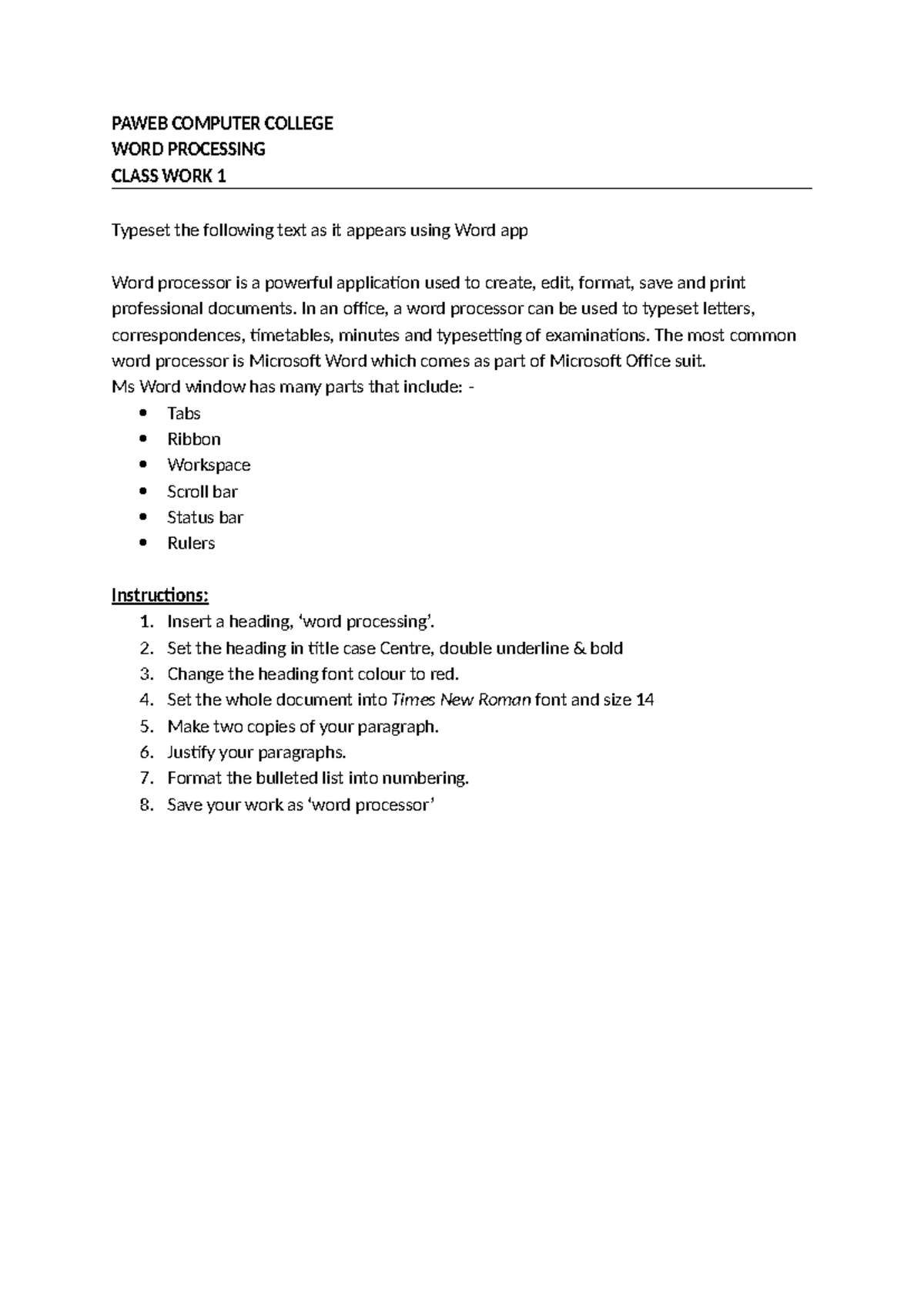 PAWEB WORD PROCESSING CLASS WORK 1: Formatting Tasks - Studocu