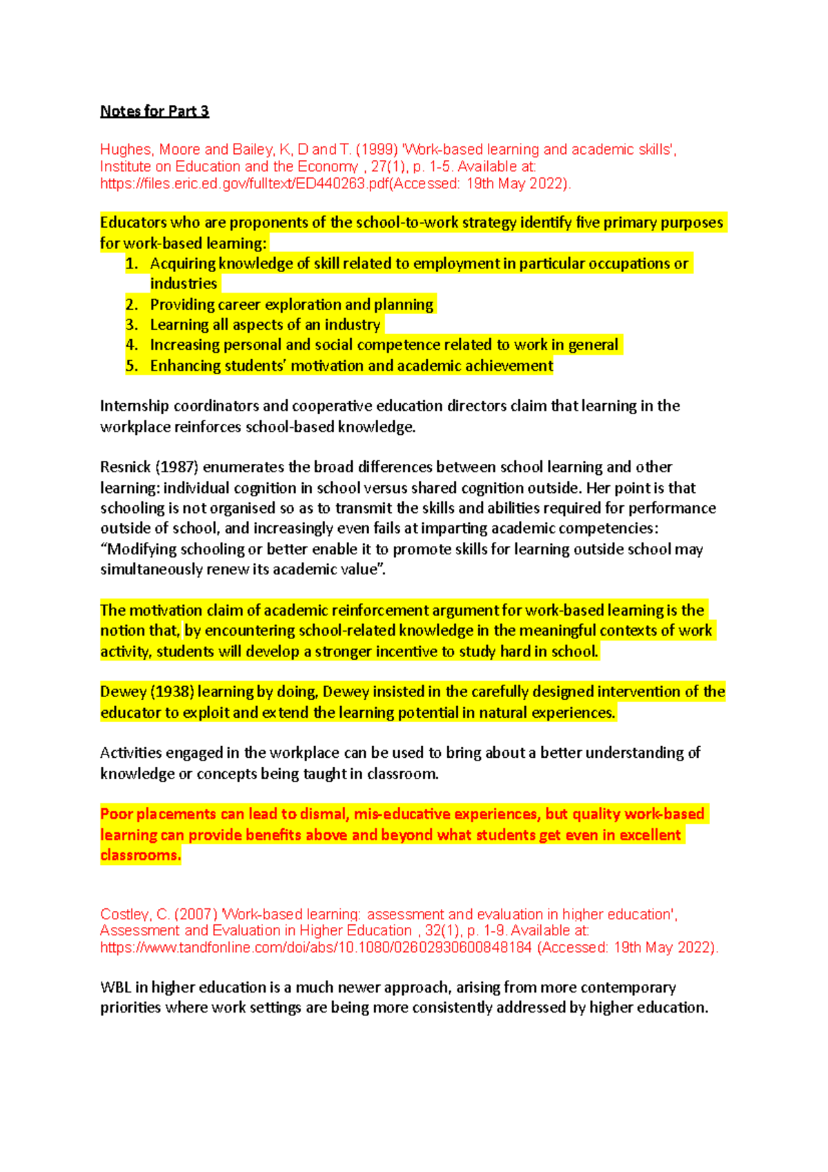 Purposes of work-based learning. - Notes for Part 3 Hughes, Moore and ...