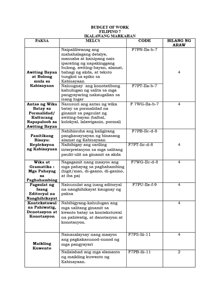 Budget of Work Filipino Q2 | PDF
