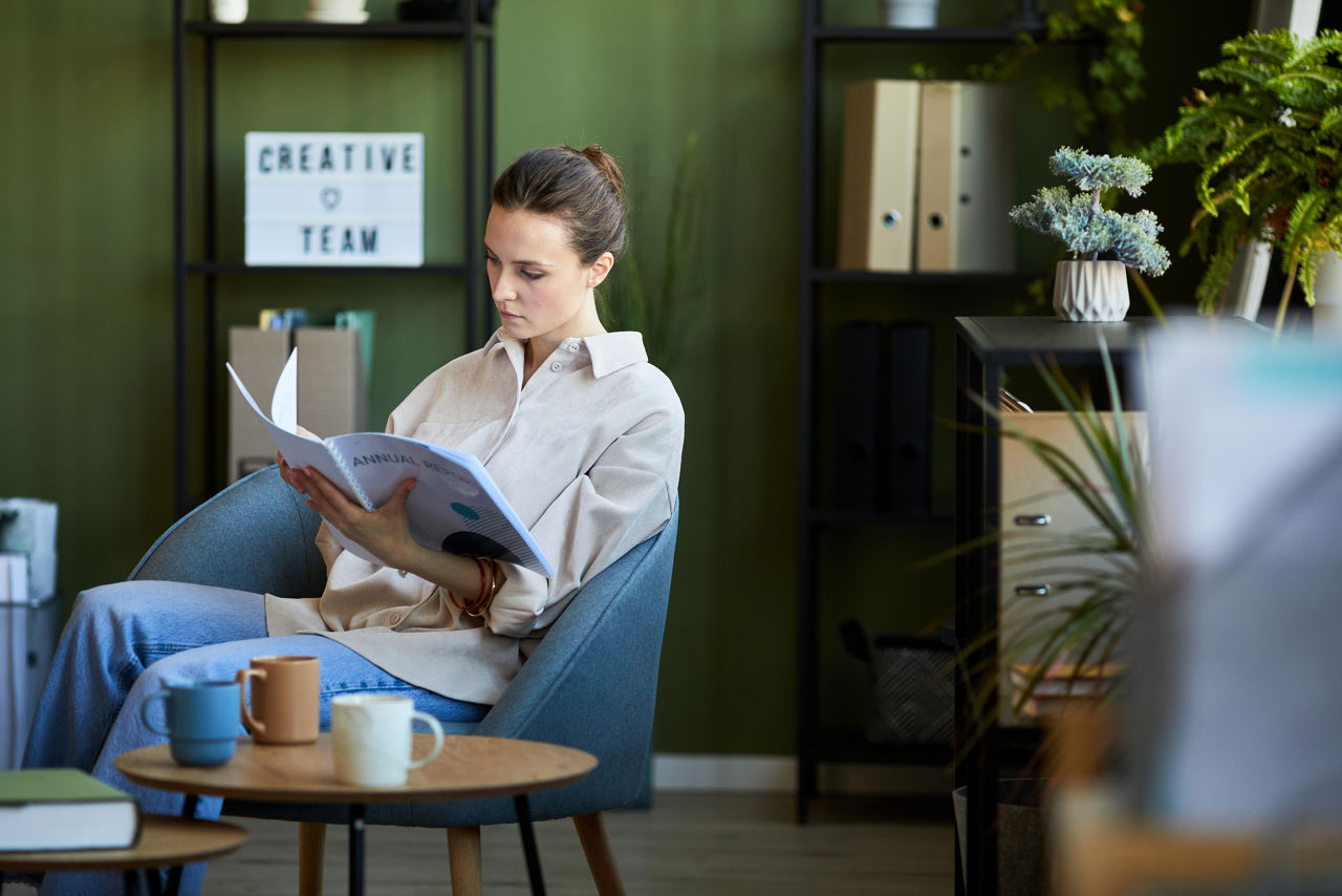 Woman reading book at work | Premium Photo
