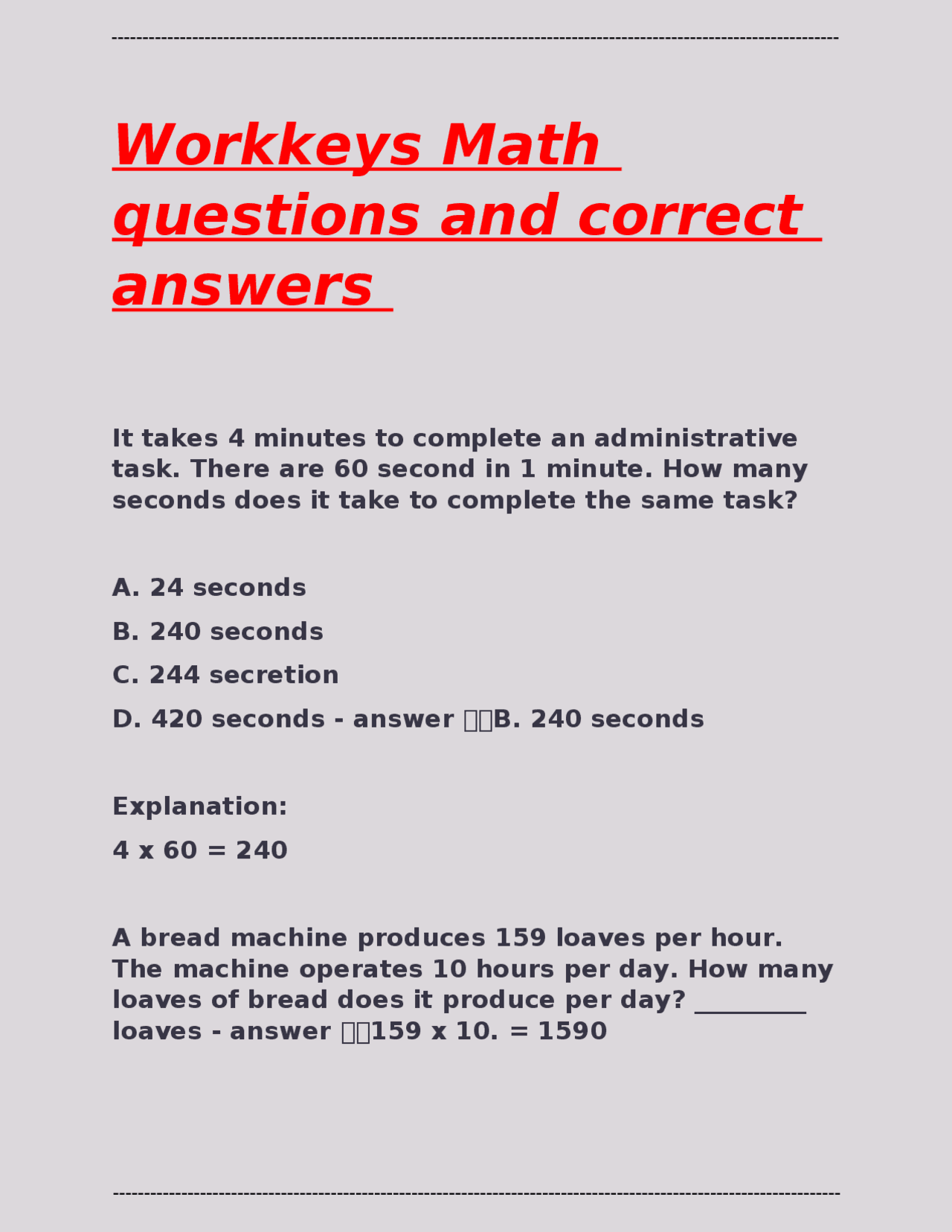 WORKKEYS MATH QUESTIONS WITH 100% VERIFIED SOLUTIONS - WORKKEYS - Stuvia US