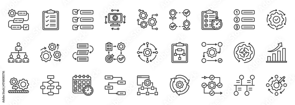 Set of 36 icons related to workflow, processing, operation. Outline ...