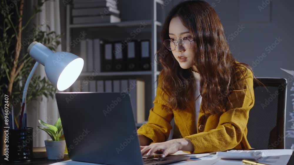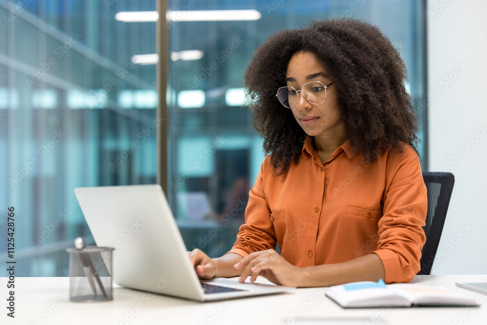 Woman working on computer in an office, focusing intensely, sitting at ...