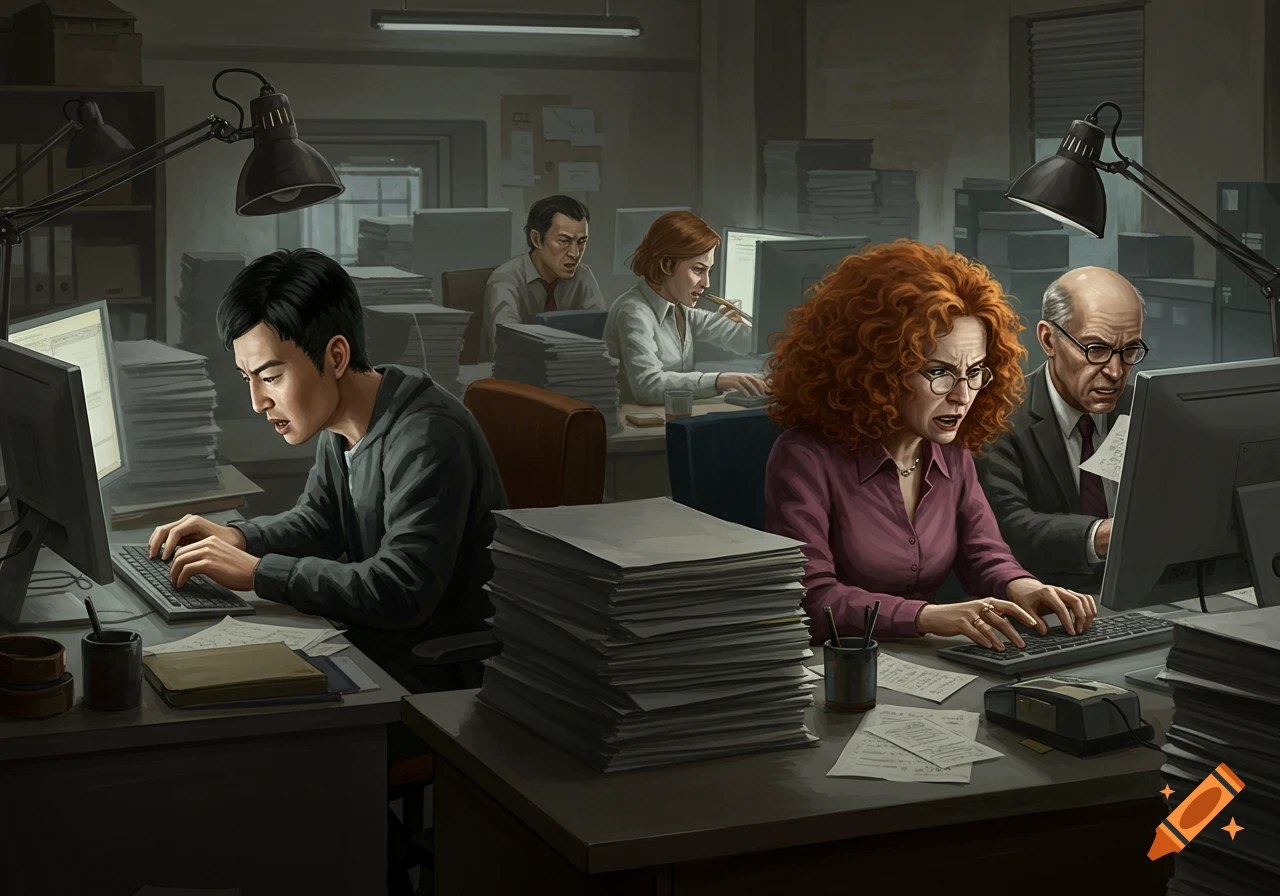 Premium Photo | Dynamic Office Scene with Swirling Papers and Intense Work