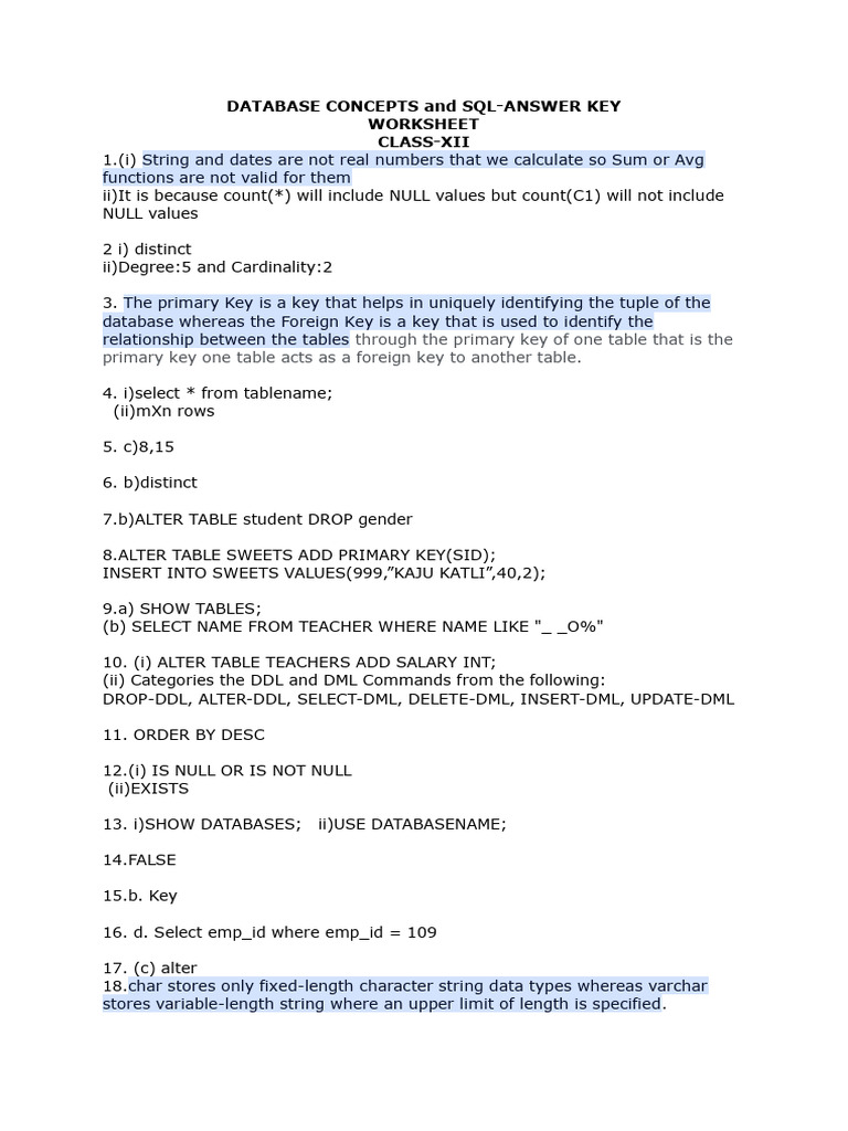 Database Concepts and SQL Worksheet Ans Key | PDF | Computer Data ...