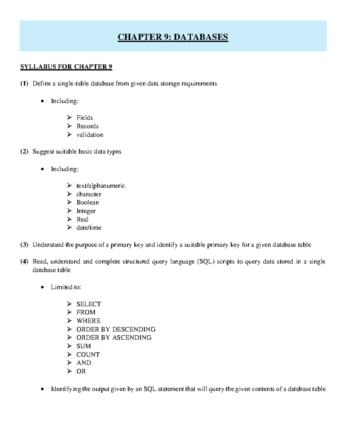 CHAPTER 9: DATABASES SYLLABUS AND SQL QUERY OVERVIEW - Studocu