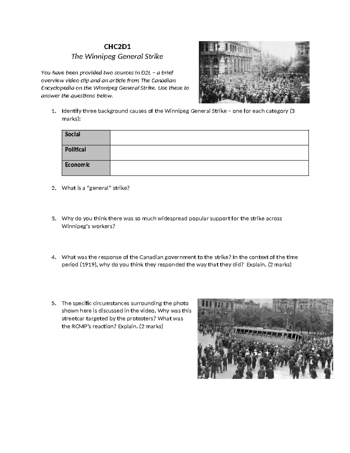 CHC2D1 Winnipeg General Strike Overview & Worksheet - Studocu