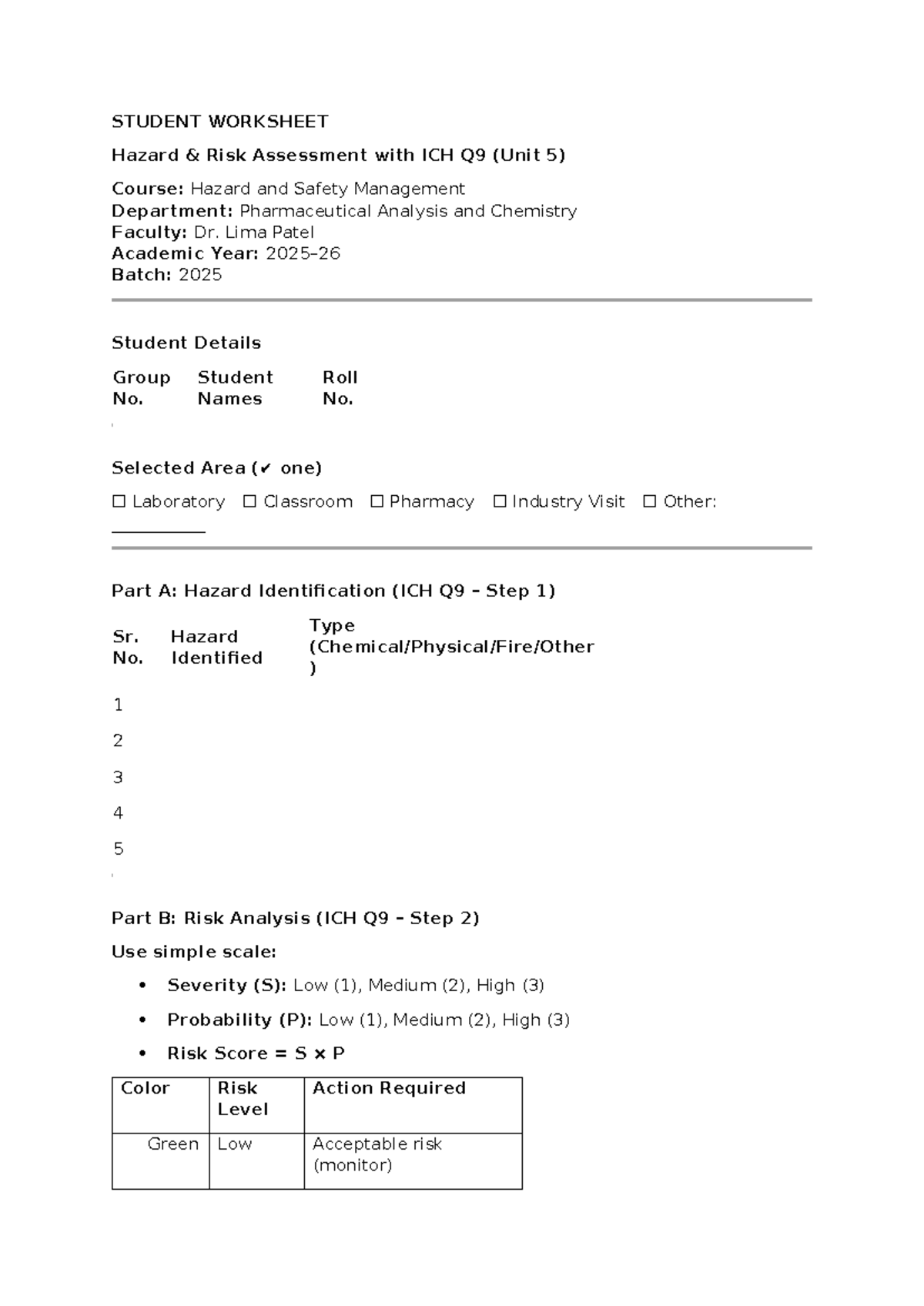Hazard Risk Assessment Worksheet (ICH Q9) - Unit 5 - Studocu