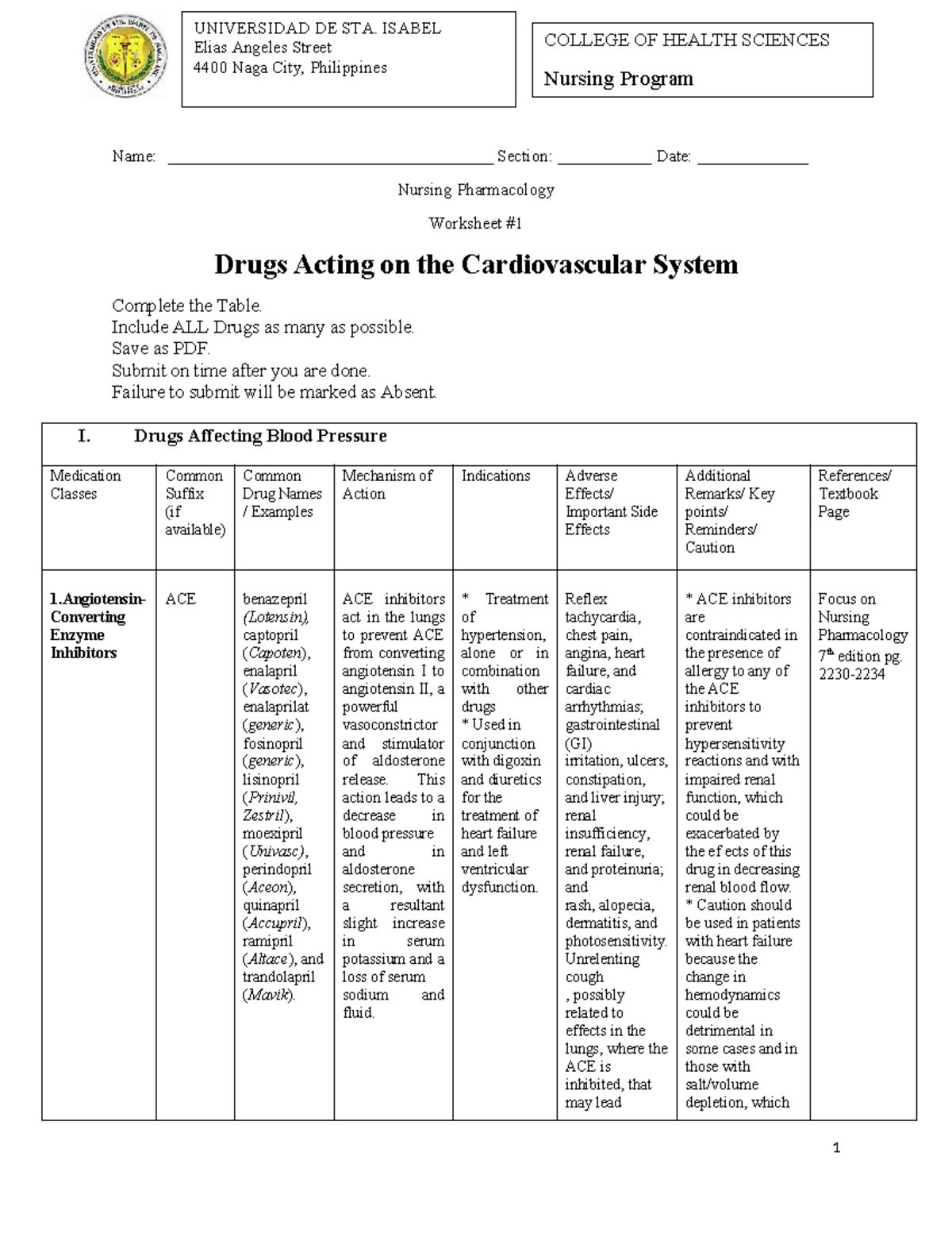 Nursing Pharmacology Worksheet: Cardiovascular Drugs (NURS 101) - Studocu