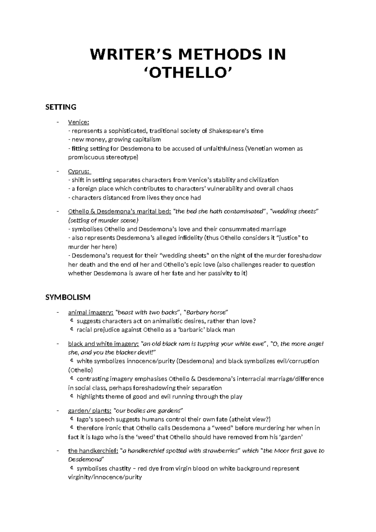 Othello Literary Analysis: Writer's Methods and Symbolism - Studocu