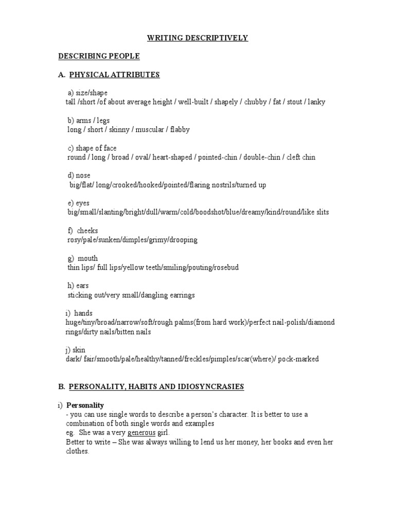 Writing Descriptively Describing People A. Physical Attributes | PDF