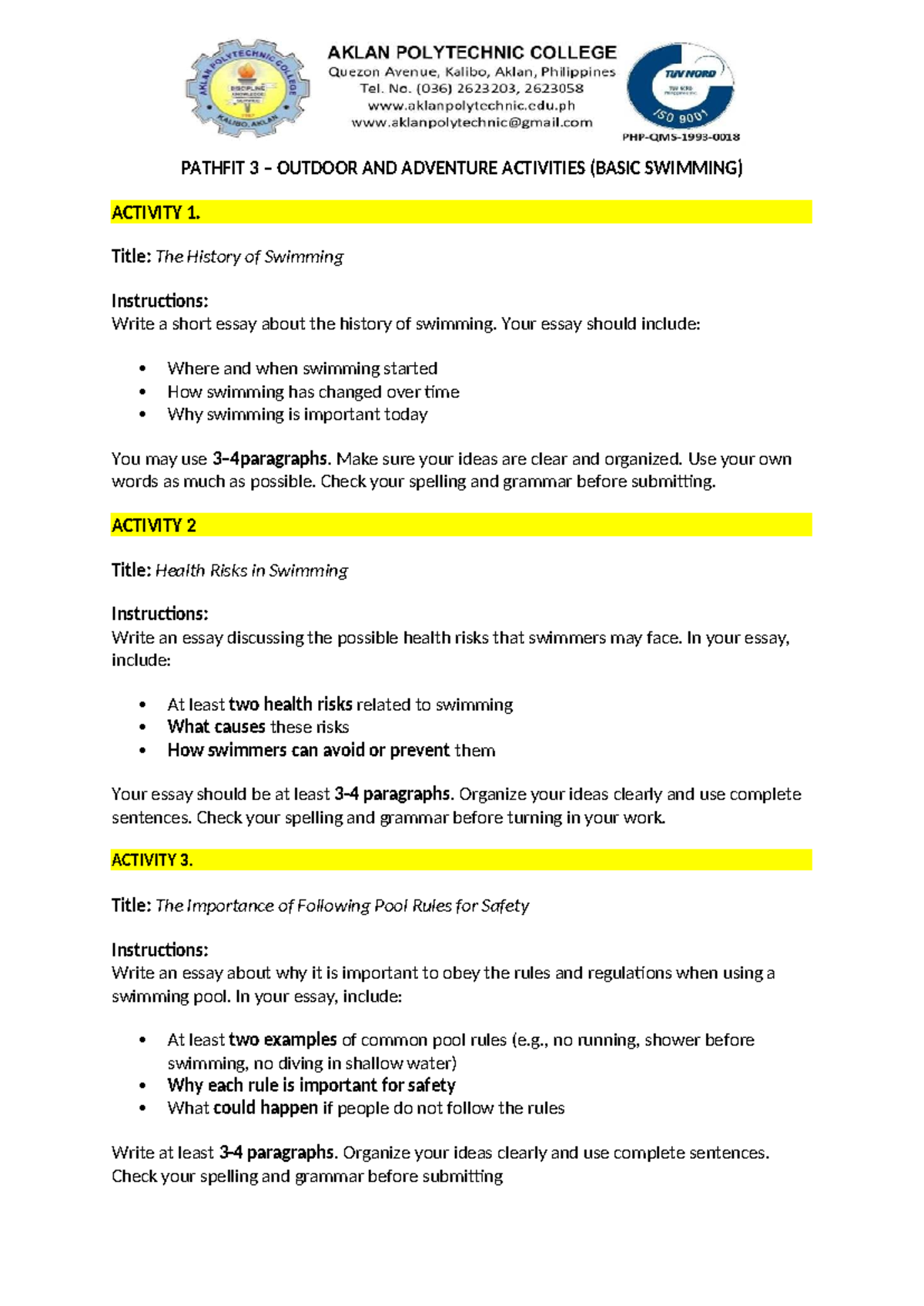 PATHFIT 3 ESSAY NOTES: SWIMMING HISTORY & SAFETY RULES - Studocu
