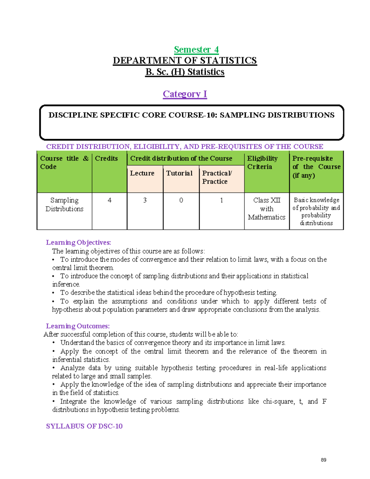 SEM4 - B.Sc. (H) Statistics Syllabus: Sampling Distributions & TQM ...