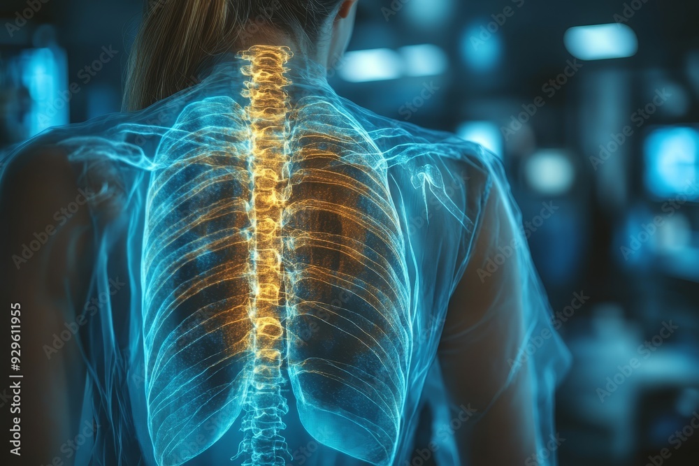 X-ray image of a human chest and spine, displaying detailed bone ...