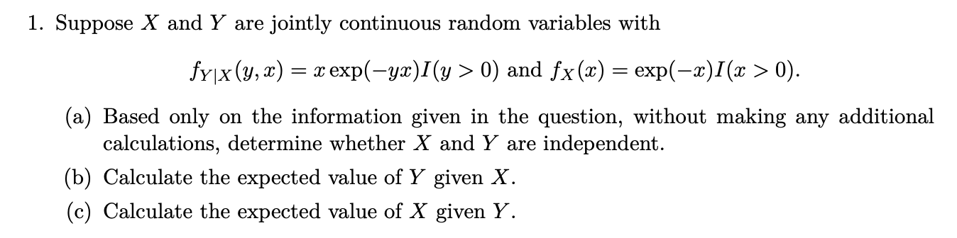 Solved fY∣X(y,x)=xexp(−yx)I(y>0) and fX(x)=exp(−x)I(x>0) (a) | Chegg.com