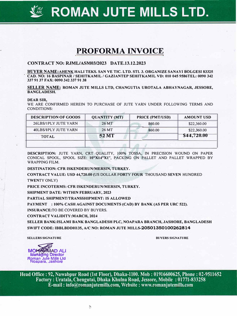 Proforma Invoice for Jute Yarn Purchase | PDF