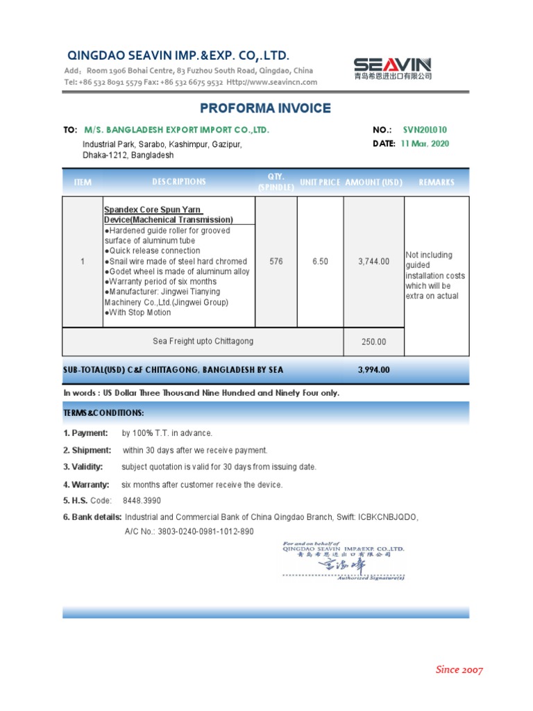 Proforma Invoice for Spandex Yarn Device | PDF