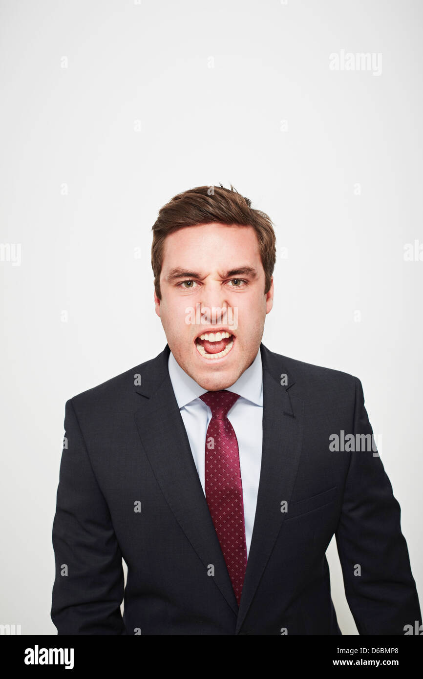 Yelling businessman portrait with mouth open on white background Stock ...