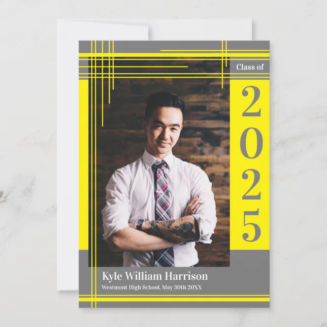 Yellow Grey School Color Graduation Photo Plaid Invitation | Zazzle