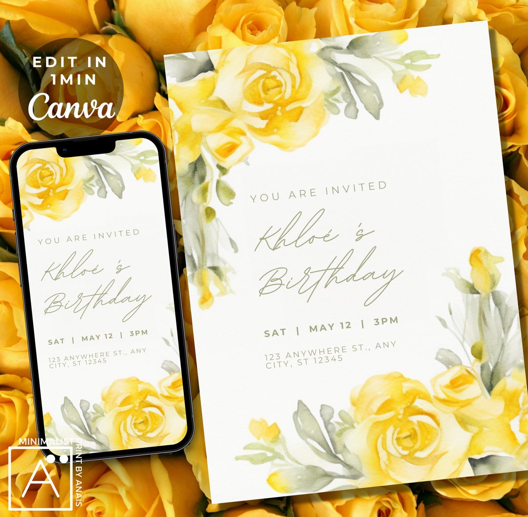 Watercolor Yellow Roses Birthday Invite, Rose Birthday Invitation ...