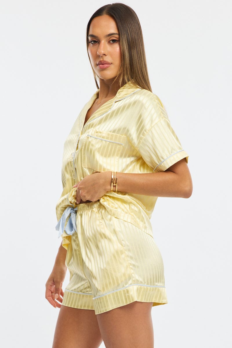 Yellow Pyjamas Set Short Sleeve Satin Jacquard | Ally Fashion