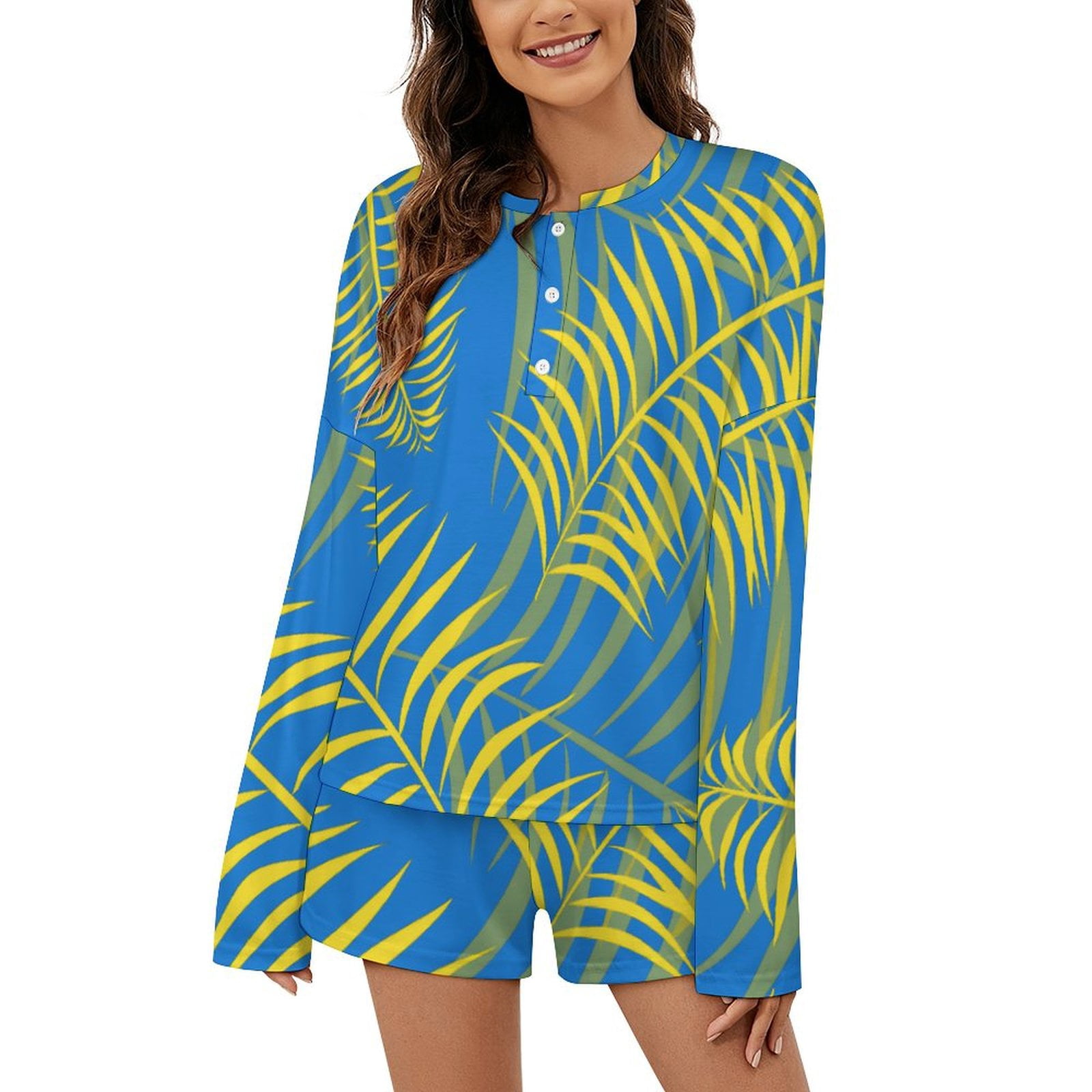 Sfneewho Botanical Yellow And White Palm Leaf Pajama Set for Women 2 ...